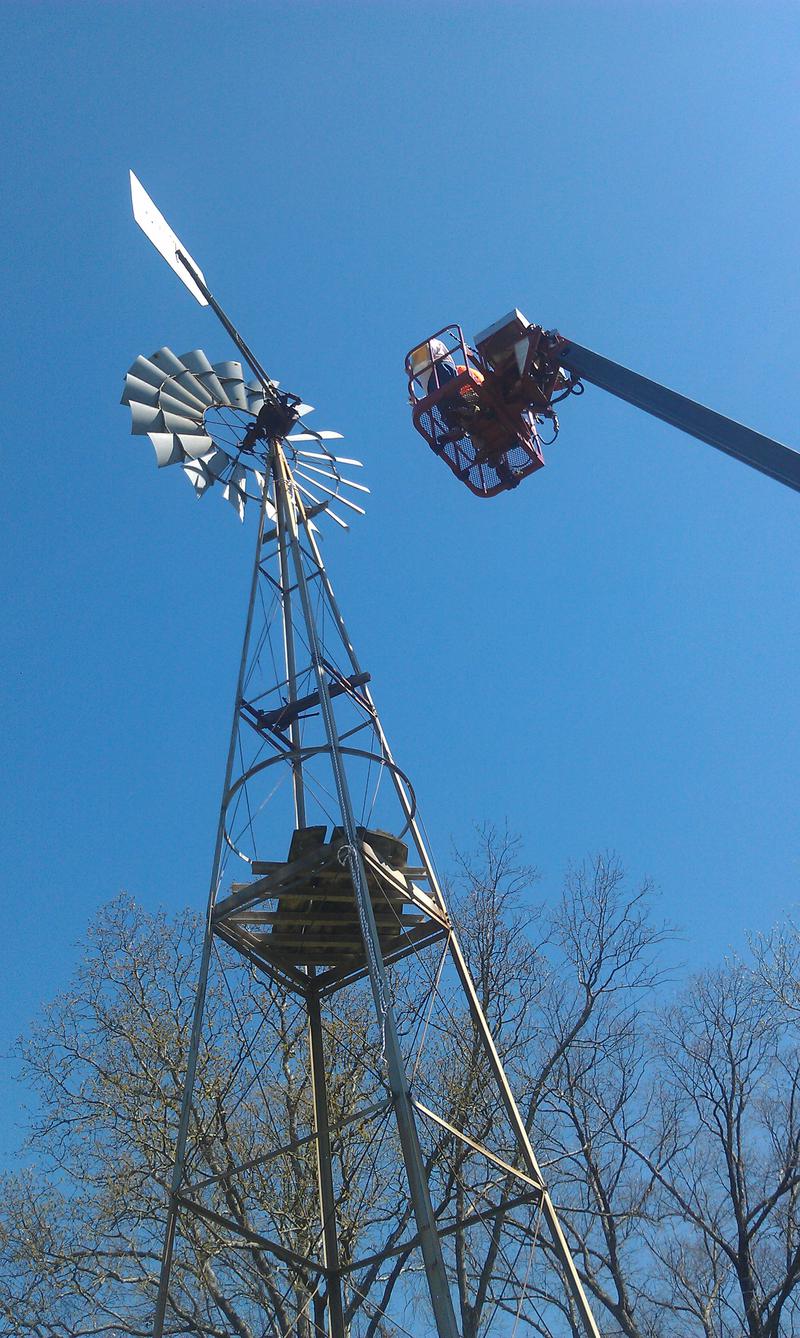 Borrowed a bucket truck to assess repairing an old 1939 chicago windmill.